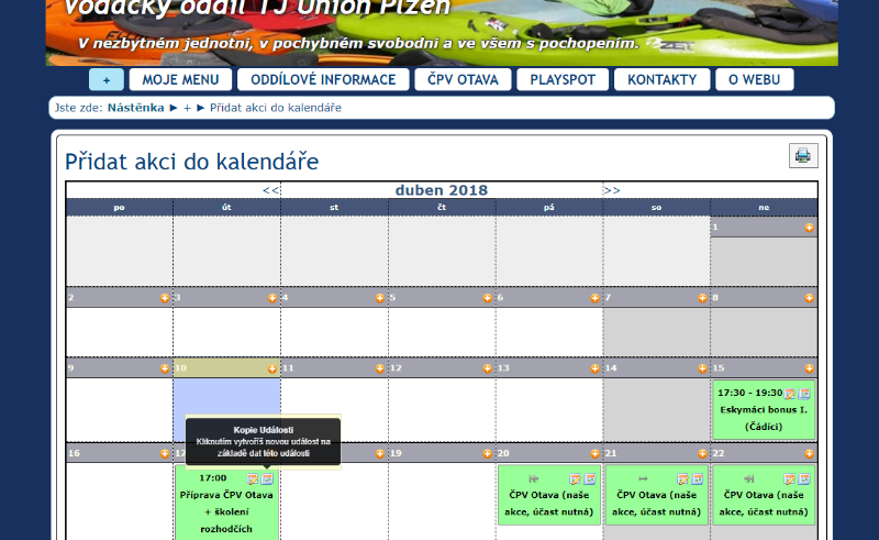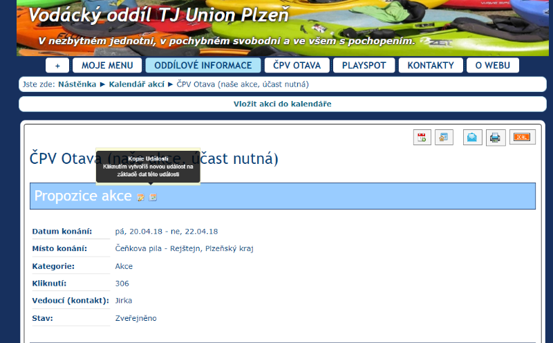 V kalendáři akcí lze udělat kopii již vytvořené akce - buď z detailu akce nebo v kalendáři, kde se vytváří nové akce přes ikonu, která je vedle ikony k editaci akce. Je to dobré, když třeba chcete vytvořit několik stejných akcí za sebou, např. Nohejbal, Eskymáci, Tělocvična apod. a nechcete pořád opisovat propozice.